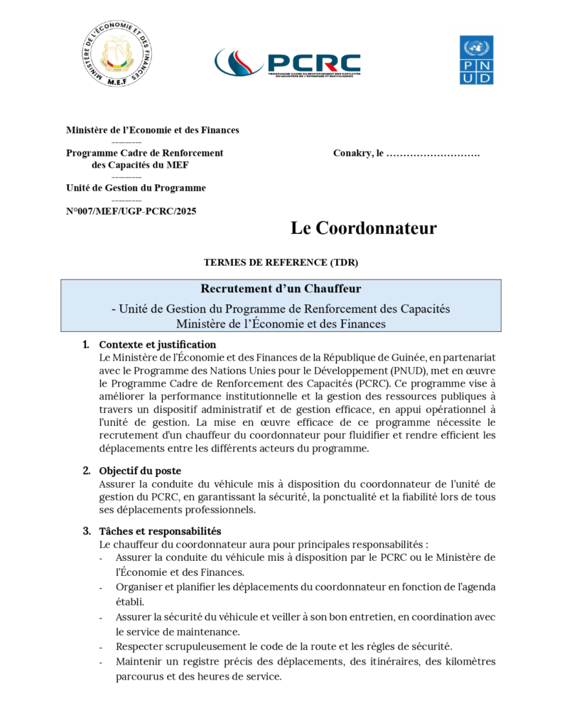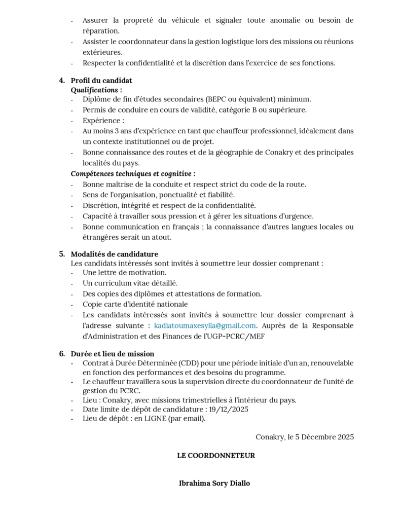 recrutement d’un chauffeur du coordonnateur pour fluidifier et rendre efficient les