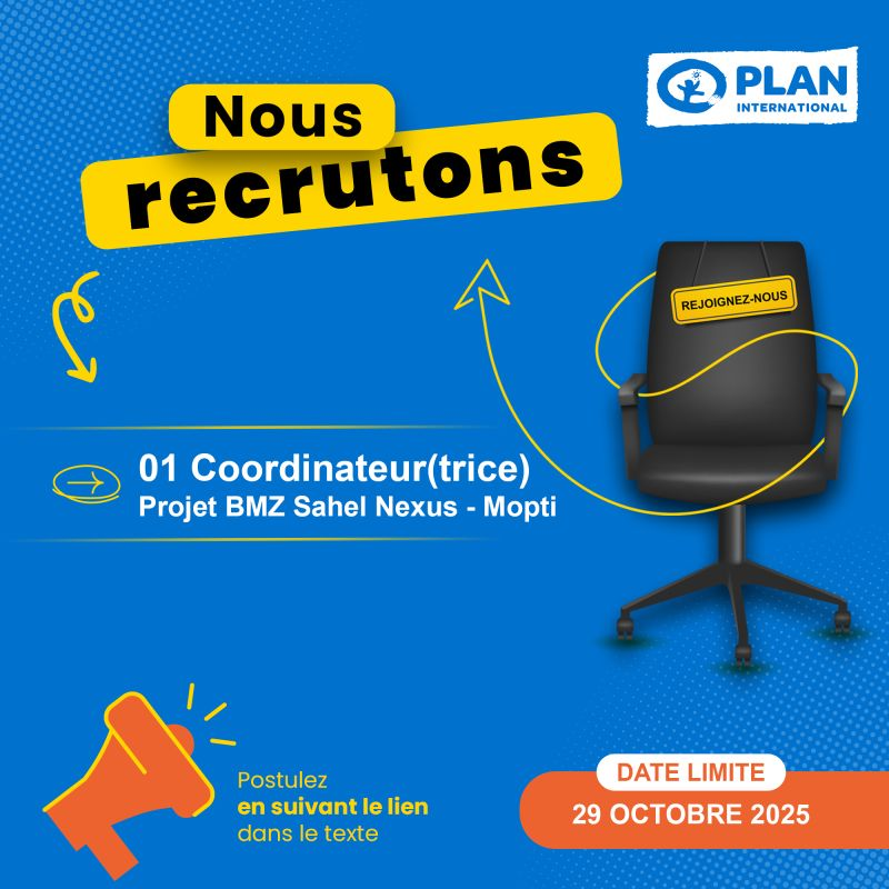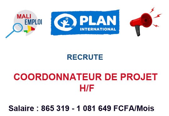 Plan International Mali, dans le cadre du démarrage de la mise en œuvre du programme Sahel au Mali, recrute 01 (un) coordinateur de projet pour assurer la coordination des activités du projet avec l’ONG partenaire, les services techniques, les collectivités et les groupes cibles sous la supervision du chef de Bureau de Mopti.