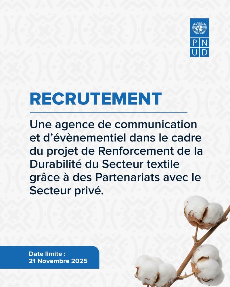 Le PNUD Mali recrute une agence de communication et d’évènementiel dans le cadre du projet de Renforcement de la Durabilité du Secteur textile grâce à des Partenariats avec le Secteur privé.