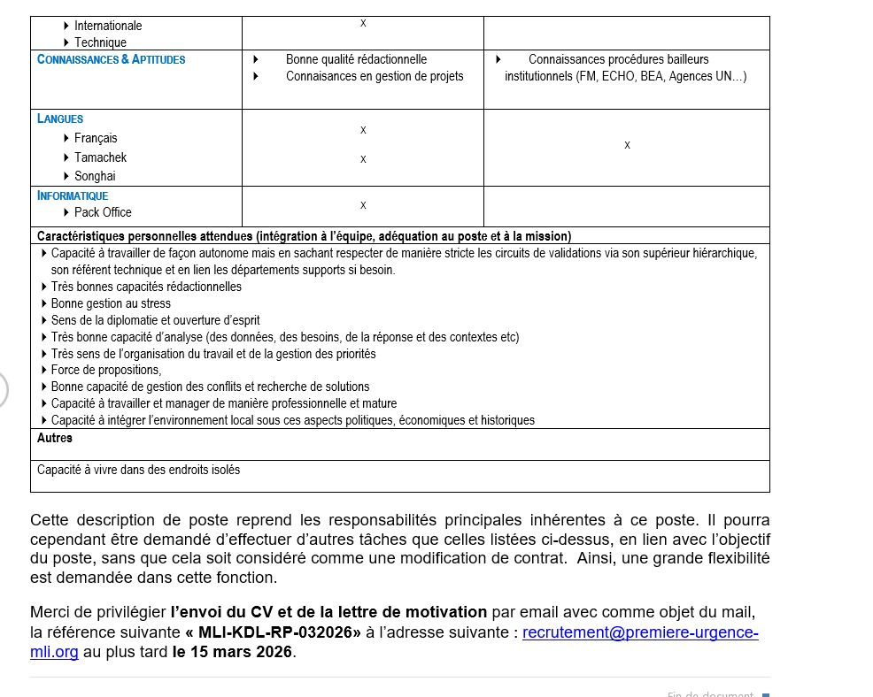 la référence suivante « MLI-KDL-RP-032026» à l’adresse suivante : recrutement@premiere-urgence-mli.org au plus tard le 15 mars 2026.