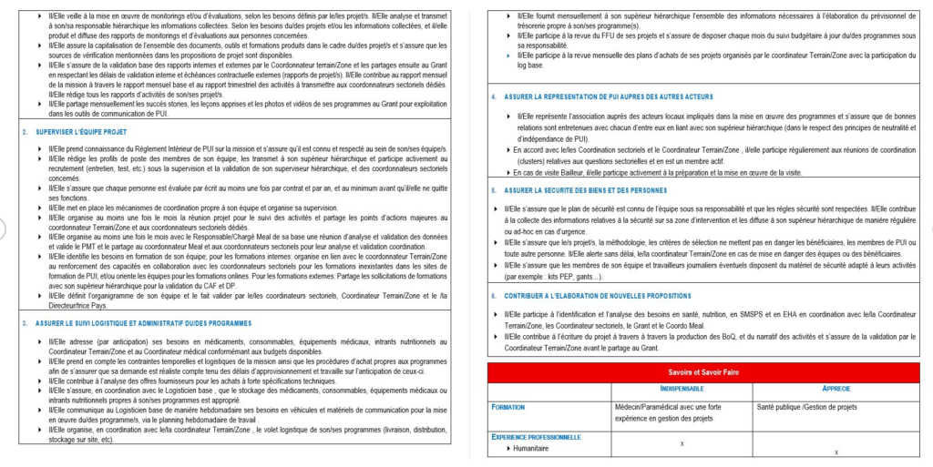 • Programmes: Il/Elle s’assure de la bonne mise en Å“uvre et du suivi du/des programme(s) sous sa responsabilité dans le respect de la politique de santé, de SMSPS et Wash de PUI.
