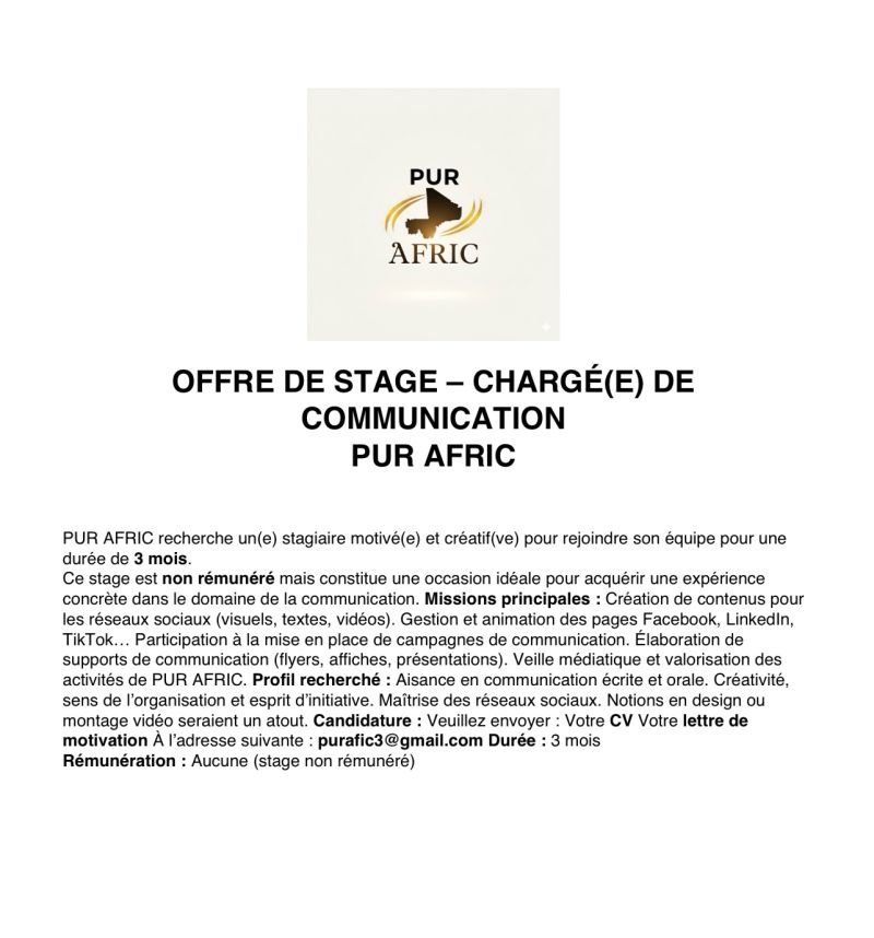 PUR AFRICPUR AFRIC recherche un(e) stagiaire motivé(e) et créatif(ve) pour rejoindre son équipe pour une