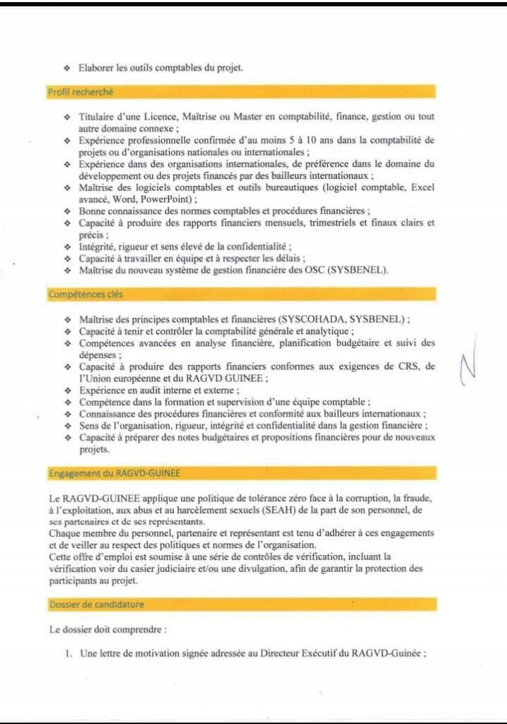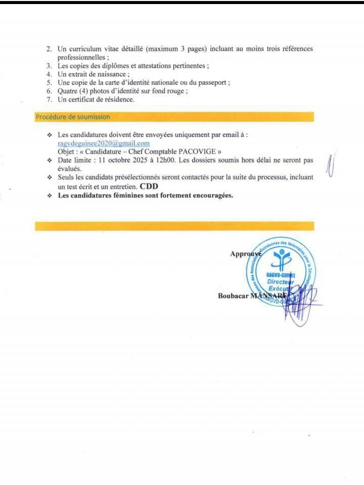 - Une lettre de motivation signée adressée au Directeur Exécutif du RAGVD-Guinée:
