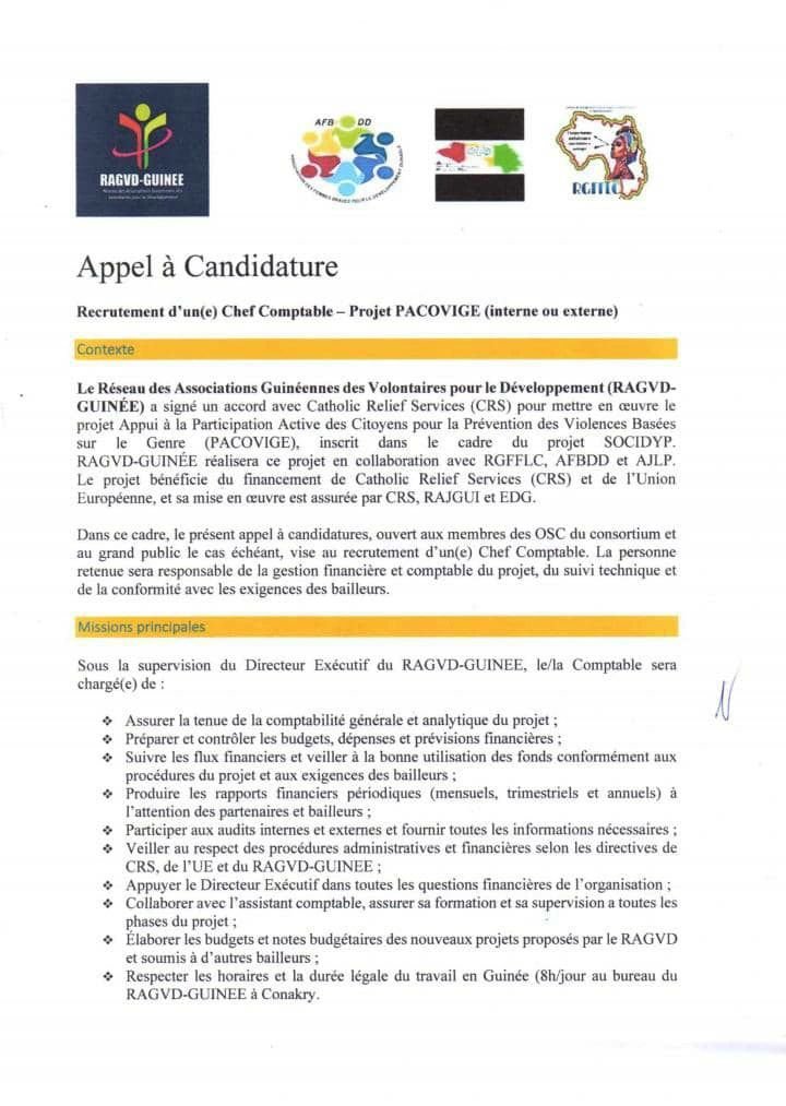 Recrutement d’un(e) Chef Comptable – Projet PACOVIGE (interne ou externe)