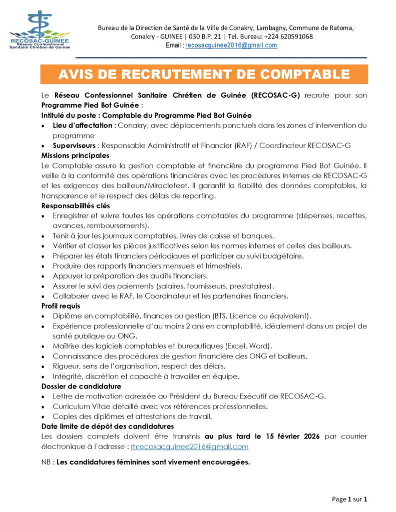 Intitulé du poste: Comptable du Programme Pied Bot Guinée