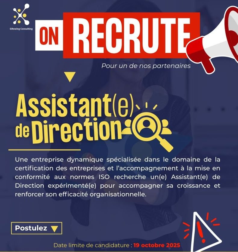 Une entreprise dynamique spĂ©cialisĂ©e dans le domaine de la certification des entreprises et lâaccompagnement Ă la mise en conformitĂ© aux normes ISO recherche un(e) Assistant(e) de Direction expĂ©rimentĂ©(e) pour accompagner sa croissance et renforcer son efficacitĂ© organisationnelle.