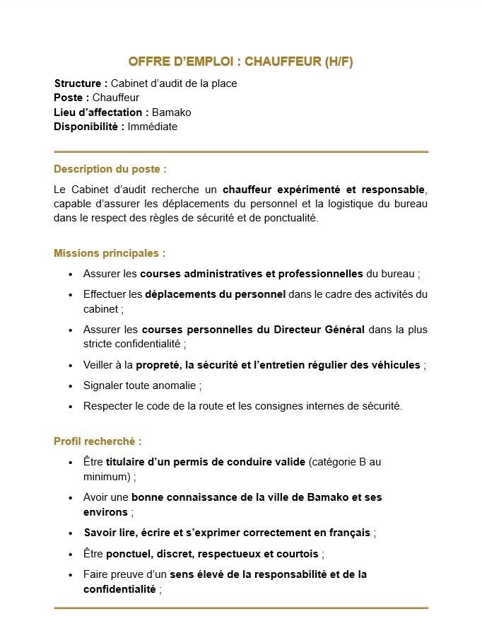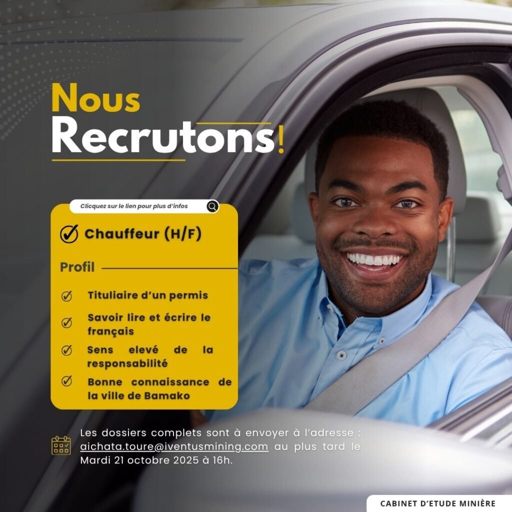 Un cabinet d’audit et d’ingénierie minière, recrute un Chauffeur_professionnel (H/F) pour renforcer son équipe à Bamako.