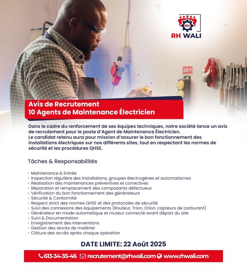 Profil recherché pour le poste : Agent de Maintenance Électricien – Conakry