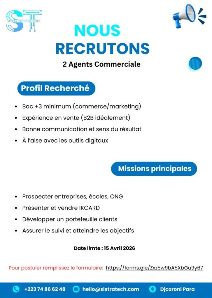 Dans le cadre de notre croissance, nous recrutons deux (02) agents commerciaux performants pour accélérer le déploiement de la solution IKCARD au Mali.