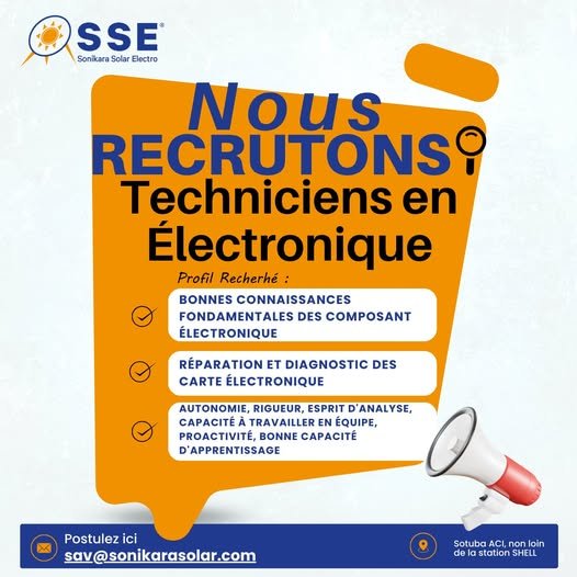 𝐒𝐨𝐧𝐢𝐤𝐚𝐫𝐚 𝐒𝐨𝐥𝐚𝐫 𝐄𝐥𝐞𝐜𝐭𝐫𝐨 recrute des 𝑻𝒆𝒄𝒉𝒏𝒊𝒄𝒊𝒆𝒏𝒔 𝒆𝒏 é𝒍𝒆𝒄𝒕𝒓𝒐𝒏𝒊𝒒𝒖𝒆 !