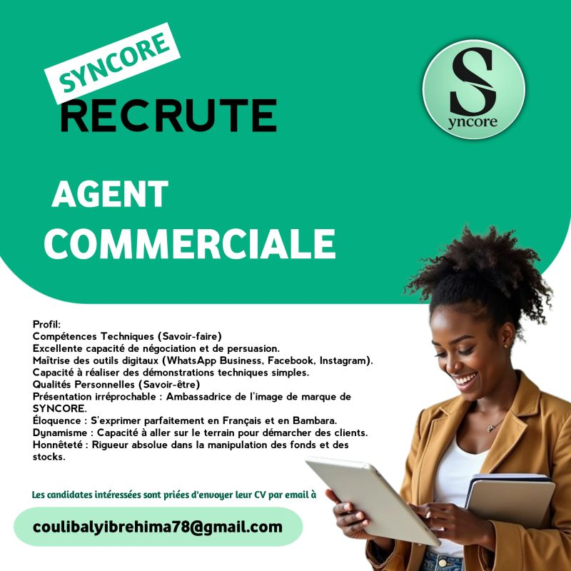 Sous la supervision du Responsable Commercial, l’Agente Commerciale a pour mission de dĂ©velopper le portefeuille client de SYNCORE, d’assurer la visibilitĂ© des produits sur le terrain et en ligne, et de garantir une expĂ©rience client d’excellence pour transformer chaque prospect en client fidèle.