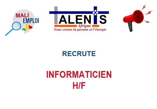 Pour toute information complĂ©mentaire adressez-vous au SecrĂ©tariat du Cabinet sis Ă  Hamdallaye ACI 2000 en face de l’ONG « JIGI », non loin du Complexe Sportif LAFIA (LCBA), Rue : 473 ou d’envoyer par e-mail Ă  : recruttalentsplusdec23@gmail.com    ou appelez au (+223) 20 22 36 71  ou visiter notre site web : www.talentsplusafrique.com