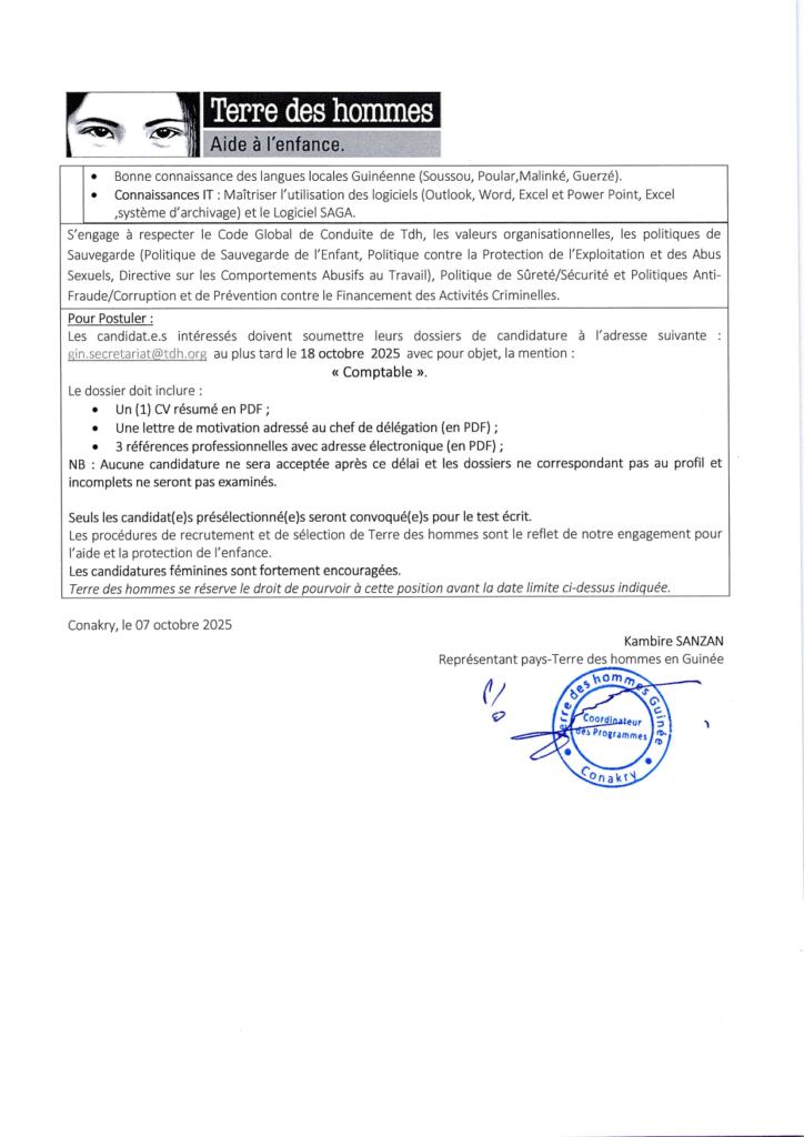 gin.secretariat@tdh.org au plus tard le 18 octobre 2025 avec pour objet, la mention: