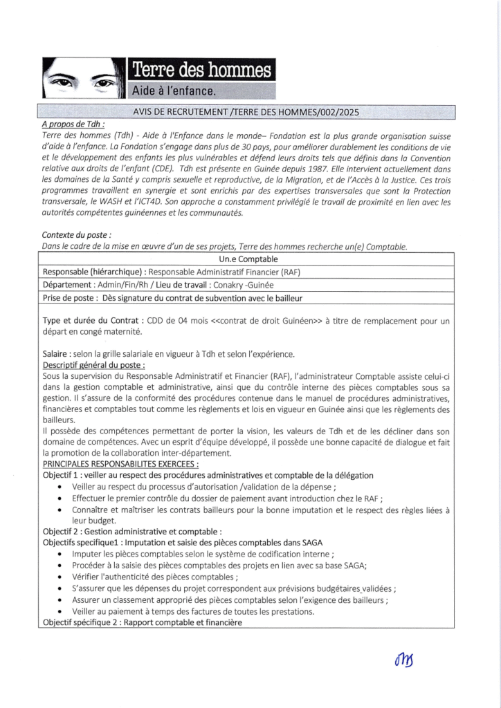 AVIS DE RECRUTEMENT/TERRE DES HOMMES/002/2025