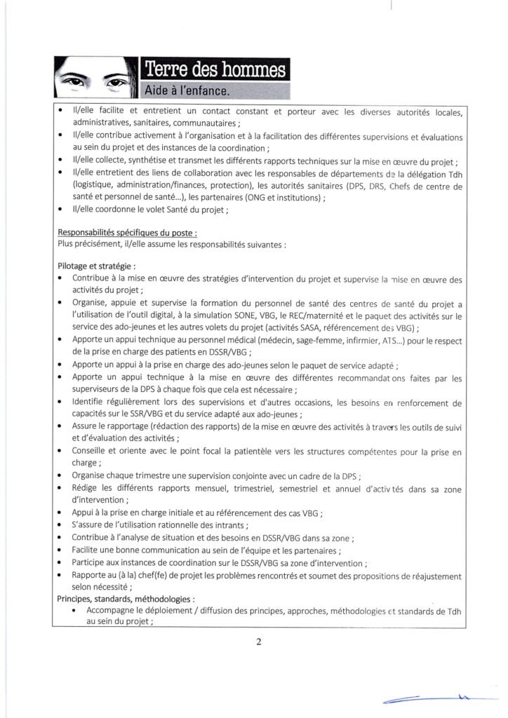 Elle. Il supervisera 2 sage-femmes/Superviseures Santé de Tdh chargées de mettre en œuvre d’ensemble du paquet