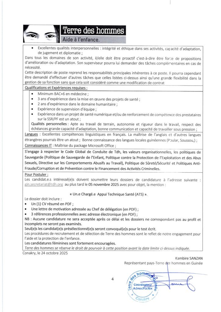 gin.secretariat@tdh.org au plus tard le 05 novembre 2025 avec pour objet, la mention :