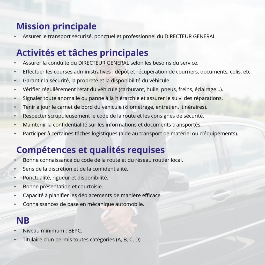 Activités et tâches principales - Assurer la conduite du DIRECTEUR GENERAL selon les besoins du service.