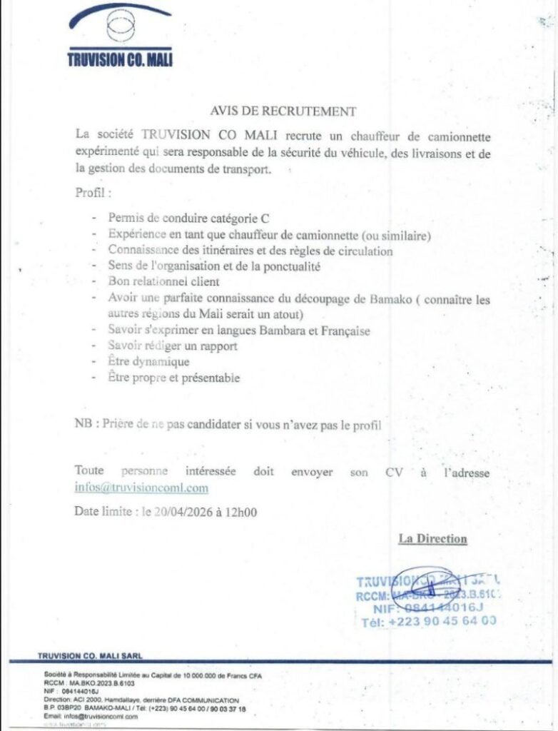 La société TRUVISION CO. MALI recrute un Chauffeur de Camionnette expérimenté.