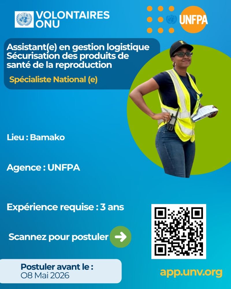 Le Fonds des Nations Unies pour la population (UNFPA) est l’agence des Nations Unies en charge de la santé sexuelle et reproductive. Il œuvre pour un monde où chaque grossesse est désirée, chaque accouchement est sans danger et chaque jeune réalise son plein potentiel. Depuis 2012, le Mali est confronté à une crise sécuritaire ayant entraîné une aggravation des besoins humanitaires. L’UNFPA, en tant que partenaire stratégique, a intensifié ses interventions en matière de santé de la reproduction, notamment par la fourniture de contraceptifs, de produits de SMNI, de kits SR et de dignité. Le volume croissant des opérations logistiques nécessite un appui additionnel pour assurer la planification, la gestion et la traçabilité des fournitures. Dans ce cadre, l’UNFPA recrute un(e) Volontaire des Nations Unies pour contribuer au renforcement de la chaîne d’approvisionnement en produits de santé de la reproduction.